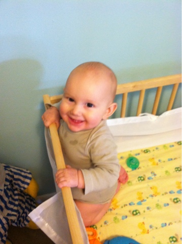 Alan has started pulling up on everything, literally. He tries to pull up on toy mounds no matter how big or small, my legs when I'm on the floor with him. Today he pulled on the baby gate that leads to the mudroom and he pulled up on the crib railing.
